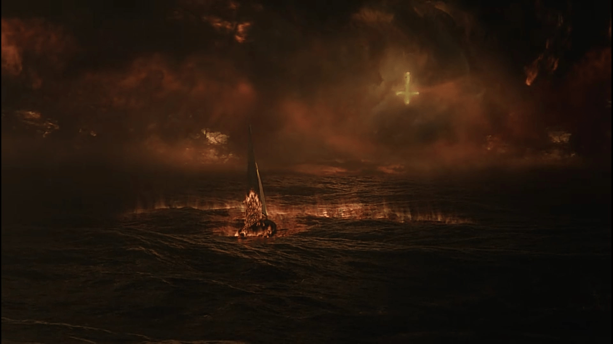 For reasons known only to George, he decides to take a boat to the hospital. Ella and Catherine chant how the gates of hell are only visible to those about to enter it. As George tries to guide his boat through the rising storm, his surroundings transform into a vision of Hell. As George’s boat is consumed by hellfire, the movie ends.